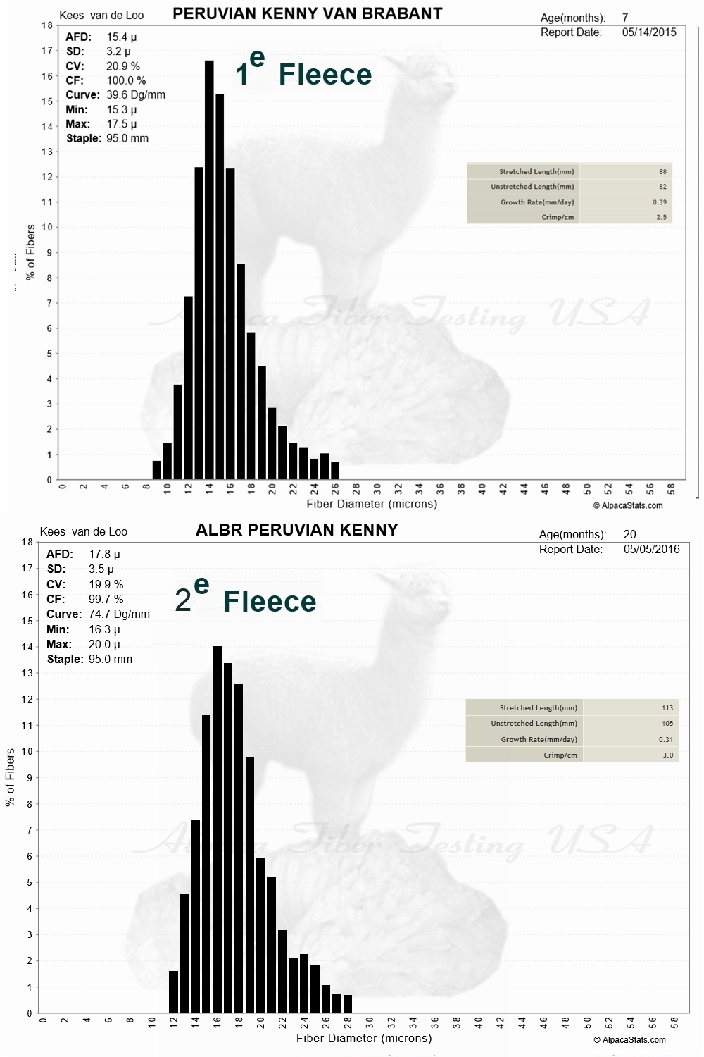 viel Crimp. Vater von Kenny ist AH Peruvian Vengador. Vengador ist ein absoluter Elite- Hengst. Er gewann auf den Shows in Hapert und Assen 2011 jeweils den Titel des Besten weißen Hengstes (Colour Grand Champion Hengste white) sowie des 2. Besten Hengstes insgesamt (Reserve Champion Hengste). Zudem wurde Vengador's Vließ mit herausragenden 88 Punkten und damit zum "Grand Champion Vließ" von Rob Bettinson bewertet. Vengador ist ein Sohn von Peruvian Valerie, die zweiten am besten ist in dem AZVD Zuchtbuch (Silberprämie, 288 Punkten). Viele Nachkommen von Valerie sind (reserve) Best of Show. Mutter von Kenny (Pip)