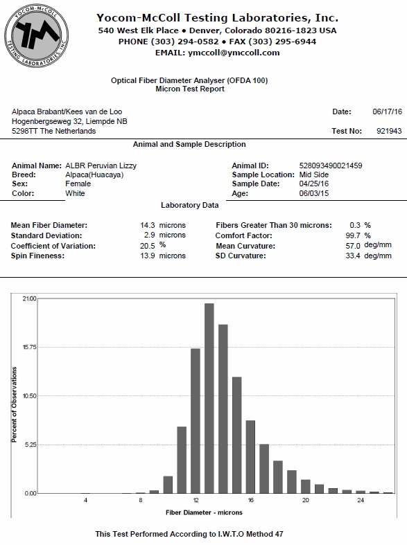 deze show 6e. Moeder van Lizzy is Wessex Abigail, die 2e werd in haar klasse in Hapert (2008) en 5e in 2009. Een dochter van Abigail is 1e geworden van 30 jonge dieren (Hapert 2012). Lizzy is een kleinzoon van Rural Alianza Wiracocha. Deze hengst komt van de wereldberoemde kudde van Rural Alianza (bekend om hun fijn blijvende wol) uit Peru. In 1994 werd hij Grand Champion op de grootste alpacashow in Peru (National Show in Arequipa) en op 13 jarige leeftijd werd hij Grand Champion in de grootste show van Engeland (Royal Bath and West). Vele nakomelingen van Wiracocha doen het zeer goed op shows in Engeland, Duitsland en Nederland. De vader van Lizzy, AH Peruvian Julian, heeft met 5 jaar nog een wol onder de 20 µm. De wol van deze hengst is,