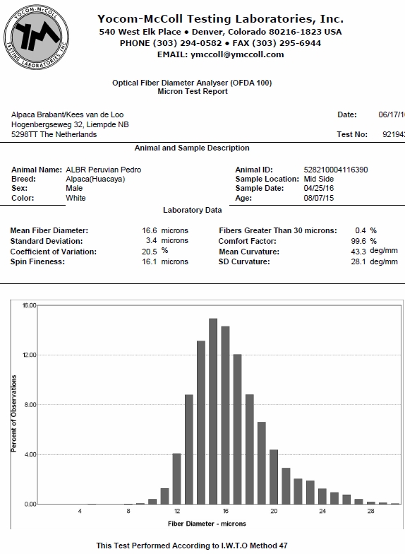 Pedro is 6e geworden op de alpacashow in Boekel (2016). De vader van Pedro, AH Peruvian Julian, heeft met 5 jaar nog een wol onder de 20 µm. De wol van deze hengst is (met 92 punten) beste vacht van de show (80 vachten) geworden in Ilshofen (Duitsland) en ook (met 85,5 punt) beste vacht van de show (75 vachten) in Wertingen (Duitsland). Het ontbreken van dekharen is een van zijn sterkste punten. Pedro is een kleinzoon van Wessex Peruvian Juliana. Juliana werd kampioen in Engeland (Royal Bath en West), Nederland en op 7 jarige leeftijd ook nog in Duitsland (Alsfeld). Grootvader van Pedro is AH Peruvian Armando die met zijn wol onder de 20 µm met 5,5 jaar behoort tot de beste alpaca’s van de wereld. Grootmoeder van Pedro is Peruvian Wessex Abigail, die 2e werd in haar klasse in Hapert (2008) en 5e in 2009. Verder zit in de stamboom Rural Alianza Wiracocha. Deze hengst komt van de wereldberoemde kudde van Rural Alianza (bekend om hun fijn blijvende wol) uit Peru. In 1994 werd hij Grand Champion op de grootste alpacashow in Peru (National Show in Arequipa) en op 13 jarige leeftijd werd hij Grand Champion in de grootste show van Engeland (Royal Bath and West). Vele nakomelingen van Wiracocha doen het zeer goed op shows in Engeland, Duitsland en Nederland. Ook zit in de stamboom Accoyo Amando. Amando is de beste hengst van het fok boek van de AZVD (goudpremie met 417 punten). Veel nakomelingen van Amando zijn (reserve) beste in show geworden.