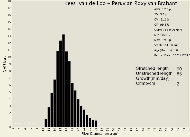Haar eerste veulen heeft ook een super fijne wol: 16,6 µm. Moeder van Roxy is Wessex Abigail, die 2e werd in haar klasse in Hapert (2008) en 5e in 2009. Een dochter van Abigail is 1e geworden van 30 jonge dieren (Hapert 2012). Roxy is een kleinzoon van Rural Alianza Wiracocha. Deze hengst komt van de wereldberoemde kudde van Rural Alianza (bekend om hun fijn blijvende wol) uit Peru. In 1994 werd hij Grand Champion op de grootste alpacashow in Peru (National Show in Arequipa) en op 13 jarige leeftijd werd hij Grand Champion in de grootste show van Engeland (Royal Bath and West). Vele nakomelingen van Wiracocha doen het zeer goed op shows in Engeland, Duitsland en Nederland. De vader van Roxy heeft op een leeftijd van ruim 5,5 jaar nog een wol onder de 20 µm, waarmee hij behoort tot de beste alpacas op de wereld. Roxy is ook een kleindochter van Peruvian Valerie, die de op een na beste merrie is van het fok boek (zilver premie met 288 punten) van de AZVD. Bijna alle nakomelingen van Valerie zijn (reserve )beste van de show geworden in Nederland en Duitsland. Roxy is ook een kleindochter van Accoyo Amando. Amando is de beste hengst van het fok boek van de AZVD (goudpremie met 417 punten). Veel nakomelingen van Amando zijn (reserve) beste in show geworden. Roxy is dus een merrie met veel potentie.